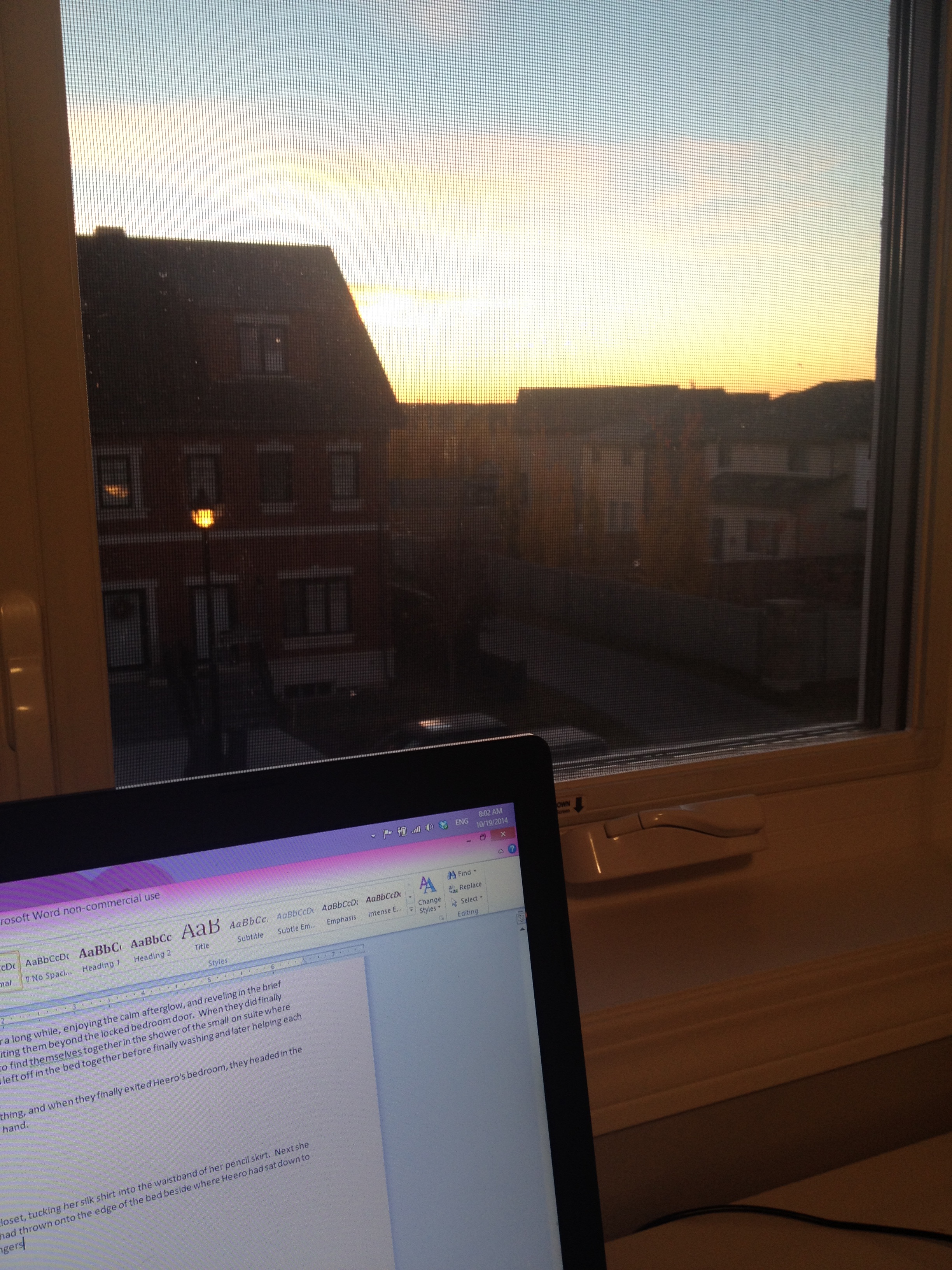 To make matters even better: I have a view. The second bedroom has four windows, two of them facing the same direction out the front of our condo as our living room. One thing I love (Especially in the winter because we have such sort days) is seeing the sun pop over the horizon as I’m working. Its a happy moment for me in the morning, and I’m glad that in moving myself upstairs and away from my chaise, I don’t have to sacrifice my morning sunshine.